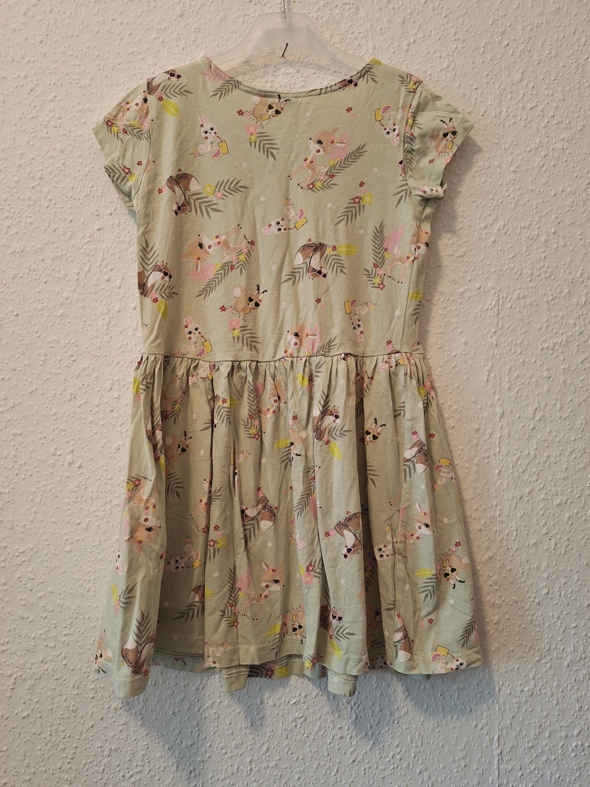 Dieses grüne Kleid für Mädchen begeistert mit einem fröhlichen Waldtier-Design, darunter Fuchs, Reh und Hase. Es hat kurze Ärmel und reicht bis zum Knie.