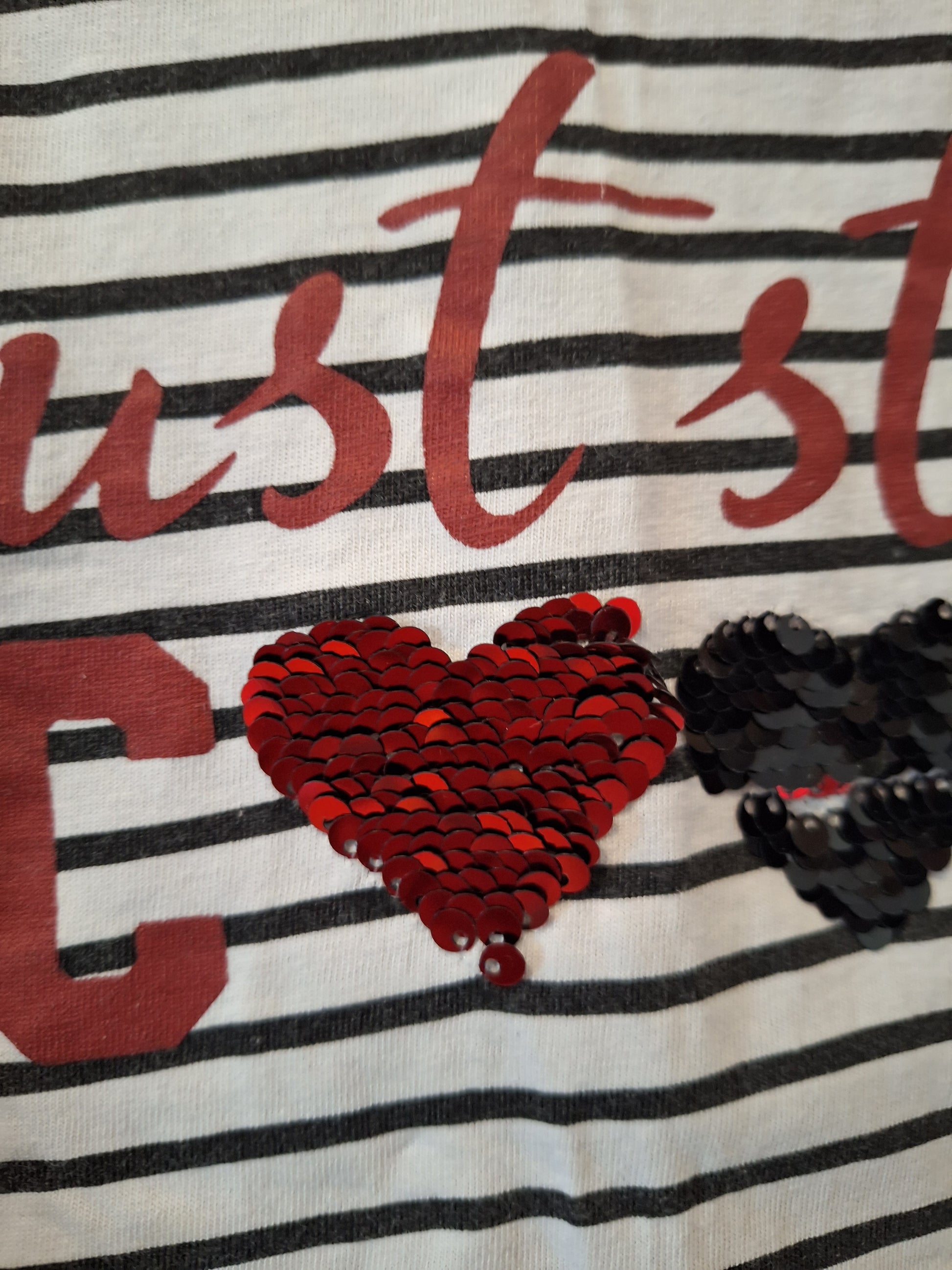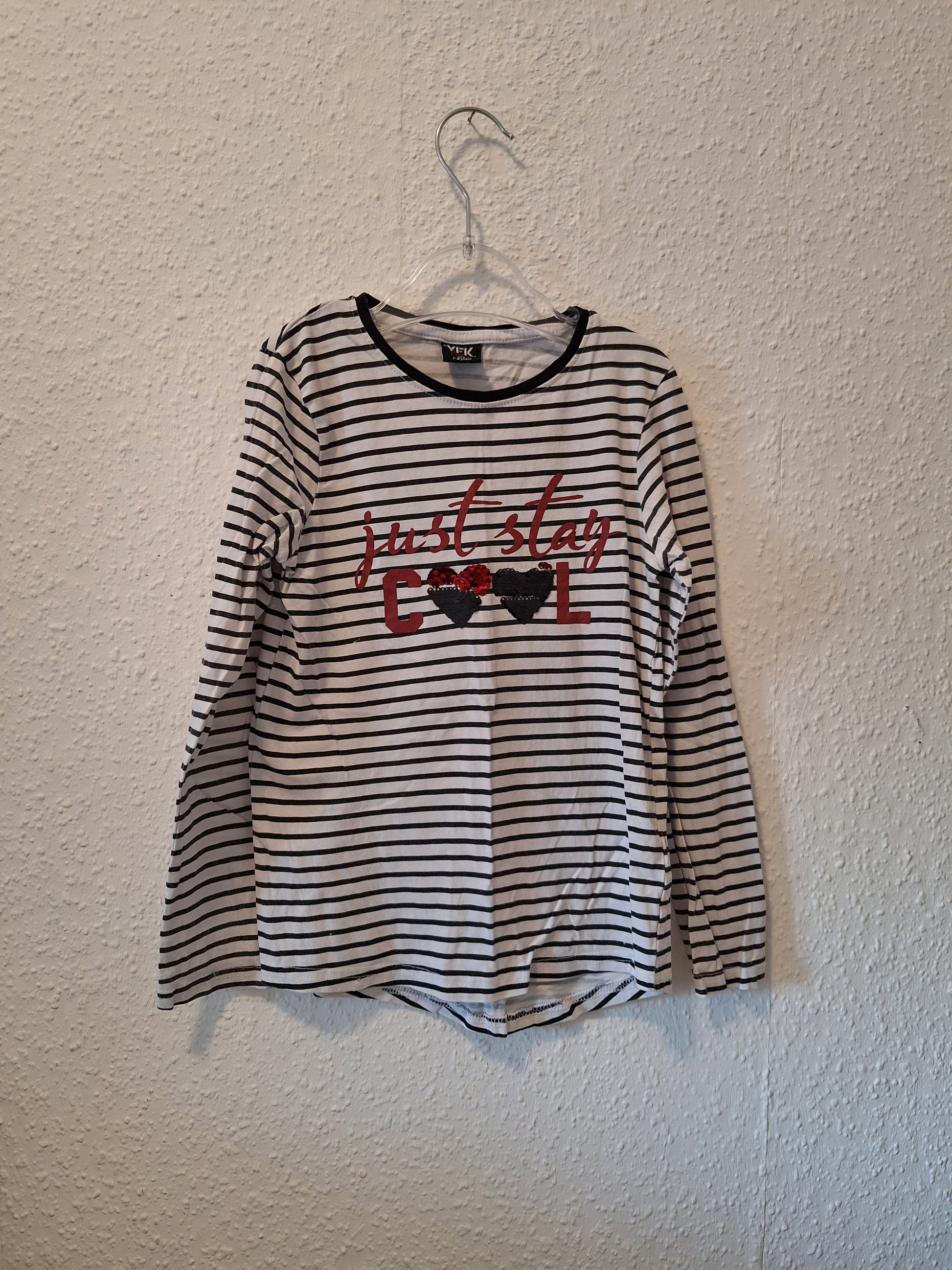 Dieses schwarz-weiß gestreifte Sweatshirt ist perfekt für kleine Mädchen, die cool bleiben wollen. Mit der Aufschrift "just stay cool" und den zwei herzförmigen Pailletten in der Mitte des Wortes ist es nicht nur stylish, sondern auch interaktiv. Die Pailletten ändern die Farbe und sorgen für einen verspielten Touch.