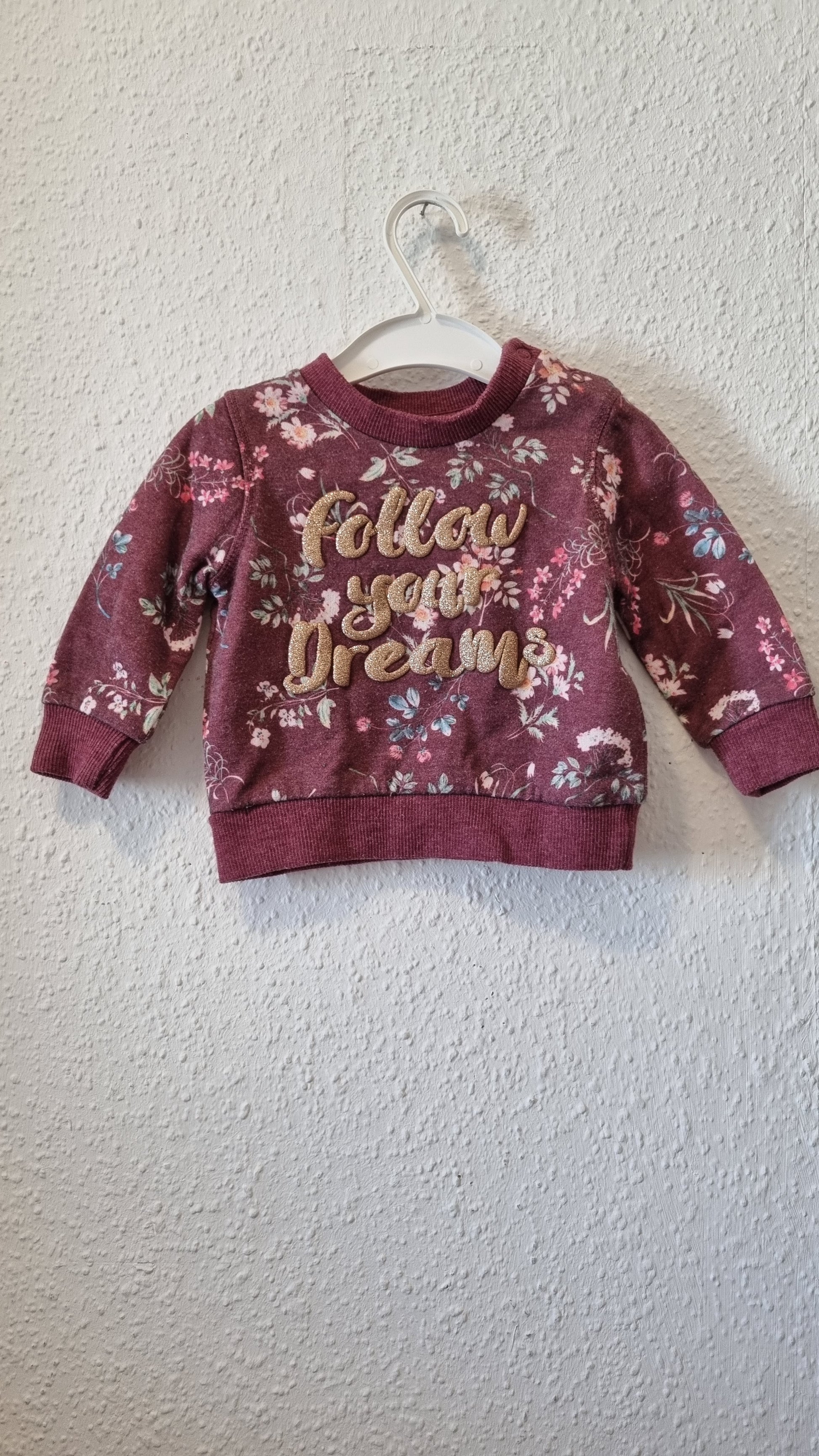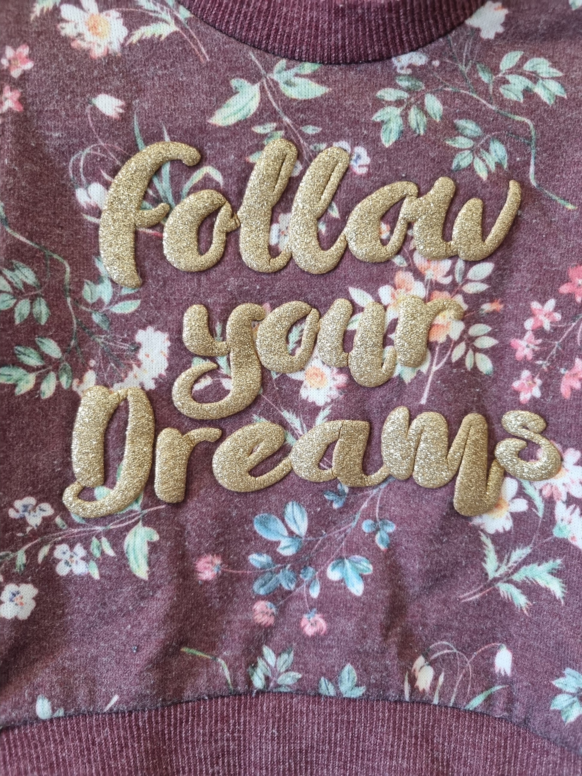 Dieser schicke Pullover in Bordeaux mit Blumenmuster ist perfekt für kleine Mädchen geeignet. Besonders hervorstechend ist die goldene 3-D Glitzerschrift "Follow your Dreams" auf der Vorderseite. Mit den Druckknöpfen an der linken Schulter ist er zudem besonders praktisch. Ideal für den Übergang und um die Träume Ihrer Kleinen zu unterstützen.