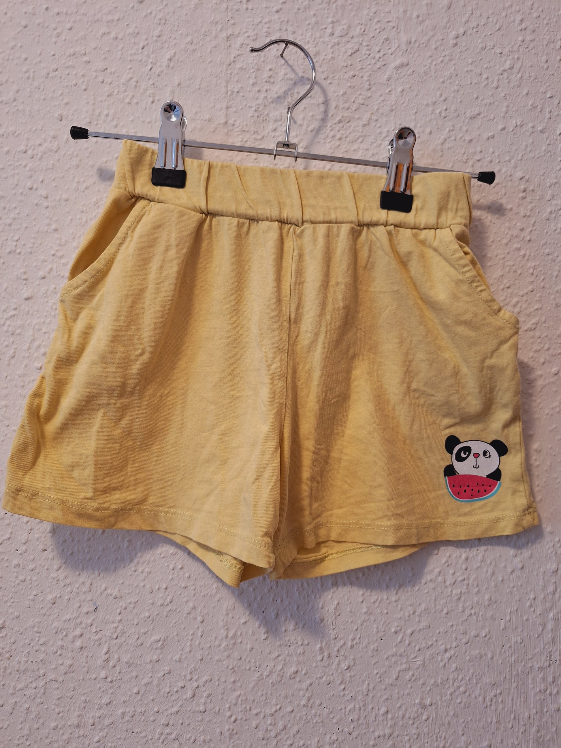 Hellgelbe Stoffshort für Mädchen in Größe 122-128 mit praktischen Vordertaschen auf beiden Seiten. Das linke Bein ziert ein süßes Panda-Motiv mit Melone Die kurze Schnittform eignet sich perfekt für warme Tage und bietet maximale Bewegungsfreiheit.
