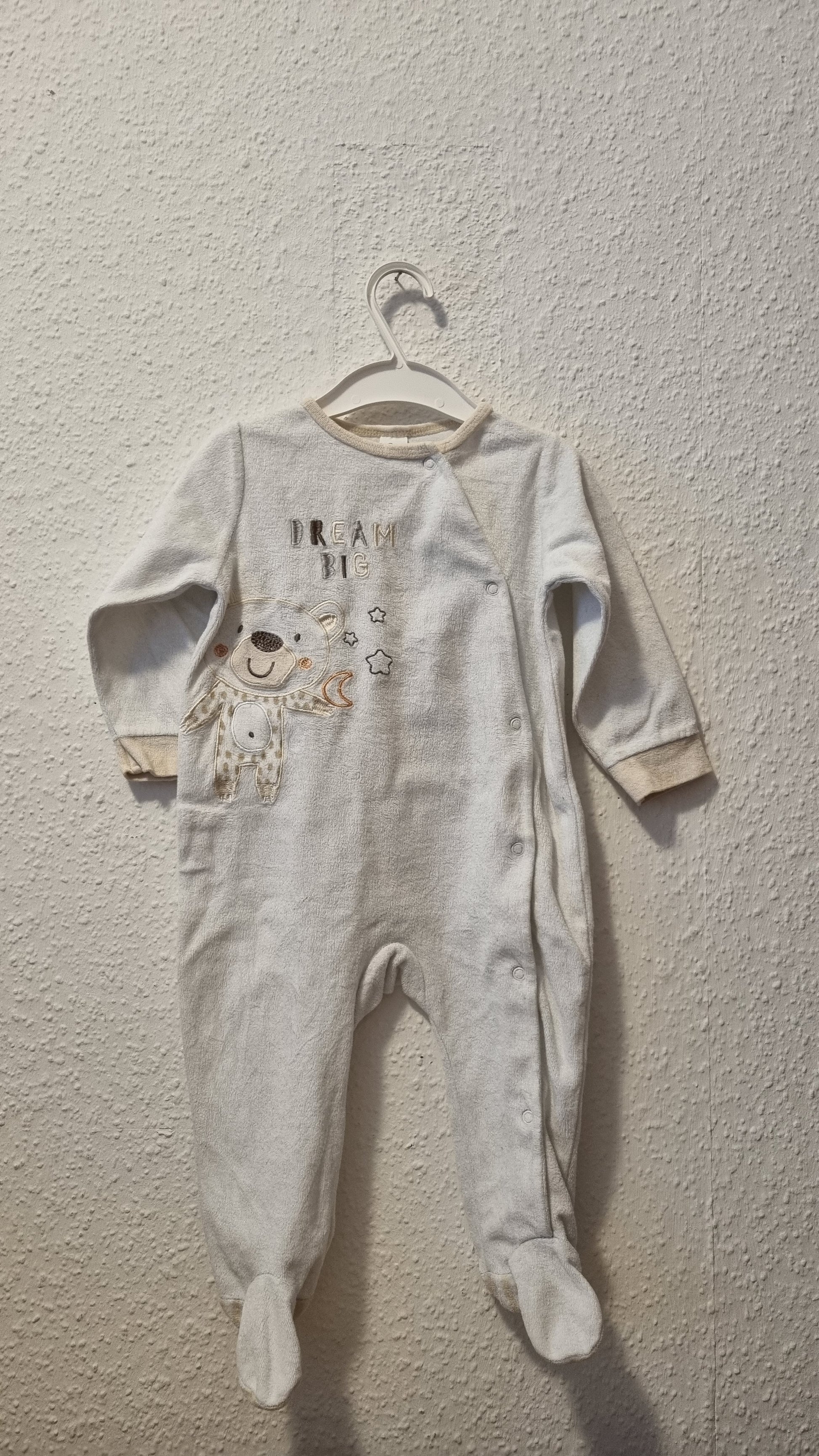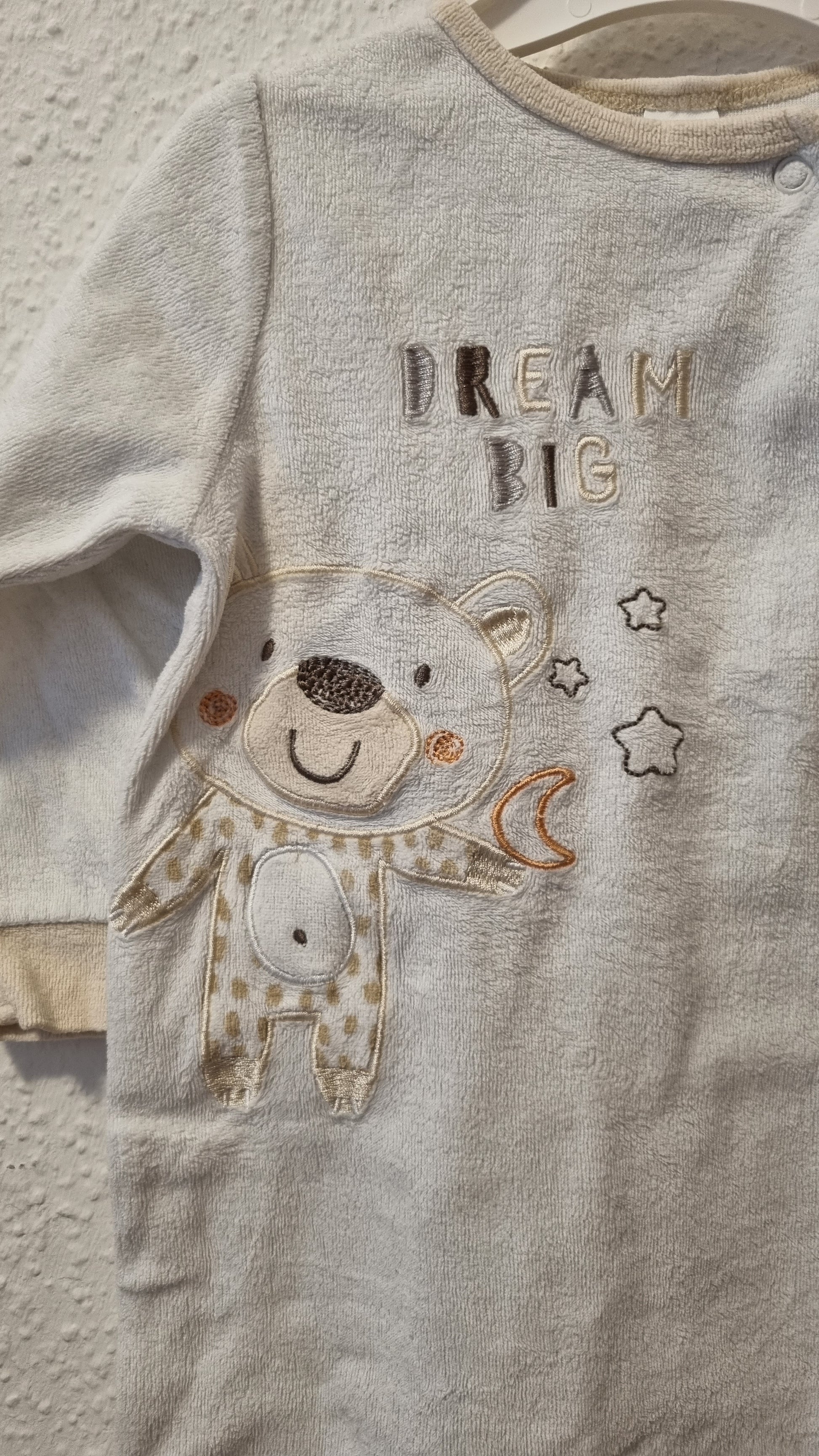 Halten Sie Ihr Kleinkind warm und gemütlich in diesem Strampler mit süßem Bärenmotiv und der inspirierenden Aufschrift "Dream Big". Mit seitlichen Druckknöpfen vom Hals bis zum Fuß ist er bequem und einfach anzuziehen.