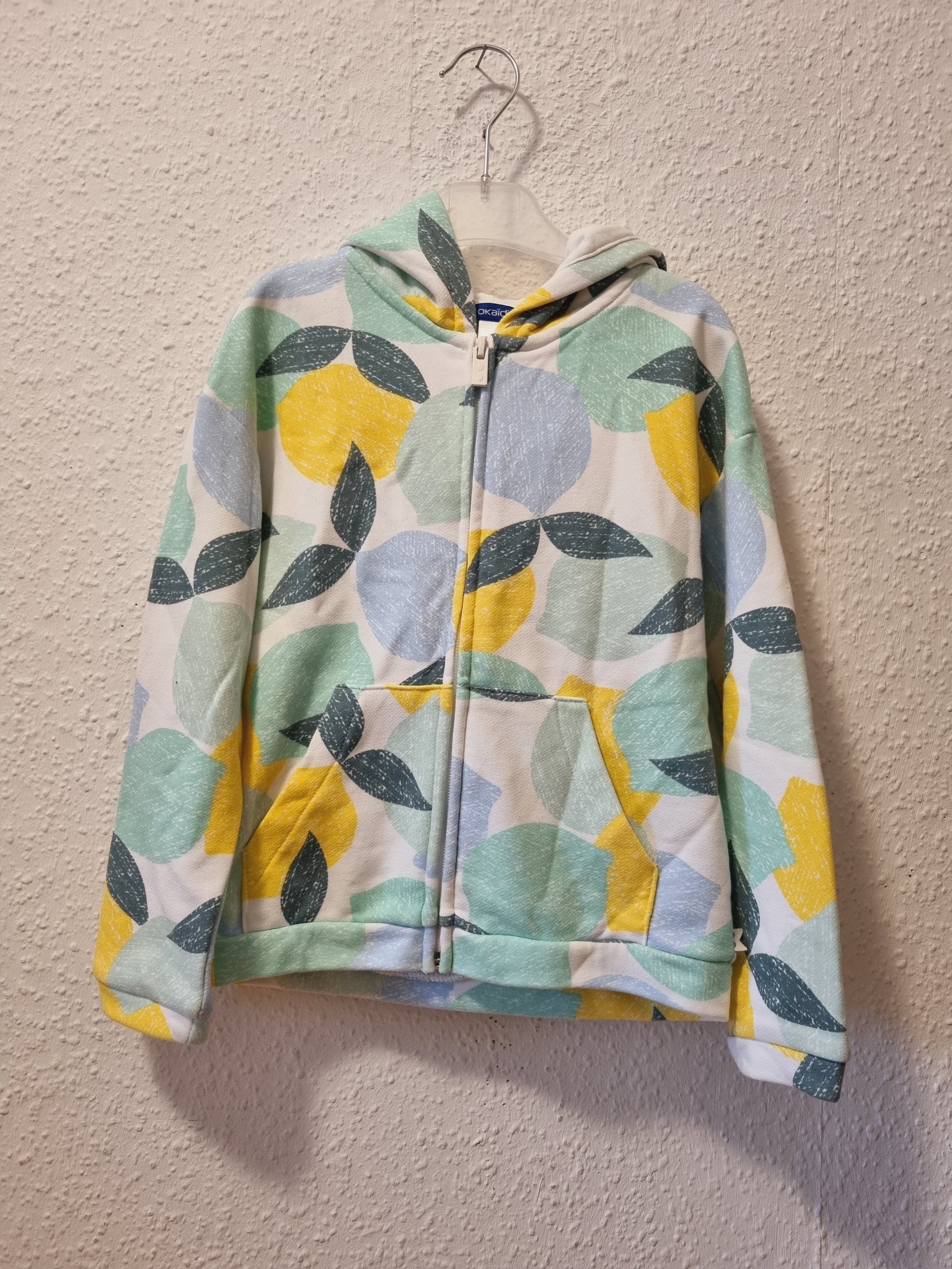 Diese sommerliche, dünne Sweatjacke für Mädchen überzeugt mit einem frischen weißen Design und einem fröhlichen Zitronenmuster. Sie hat eine praktische Kapuze, einen weißen Reißverschluss vorne und beidseitige Taschen, die Platz für kleine Schätze bieten. Ideal für leichte Abende oder kühle Tage im Sommer.