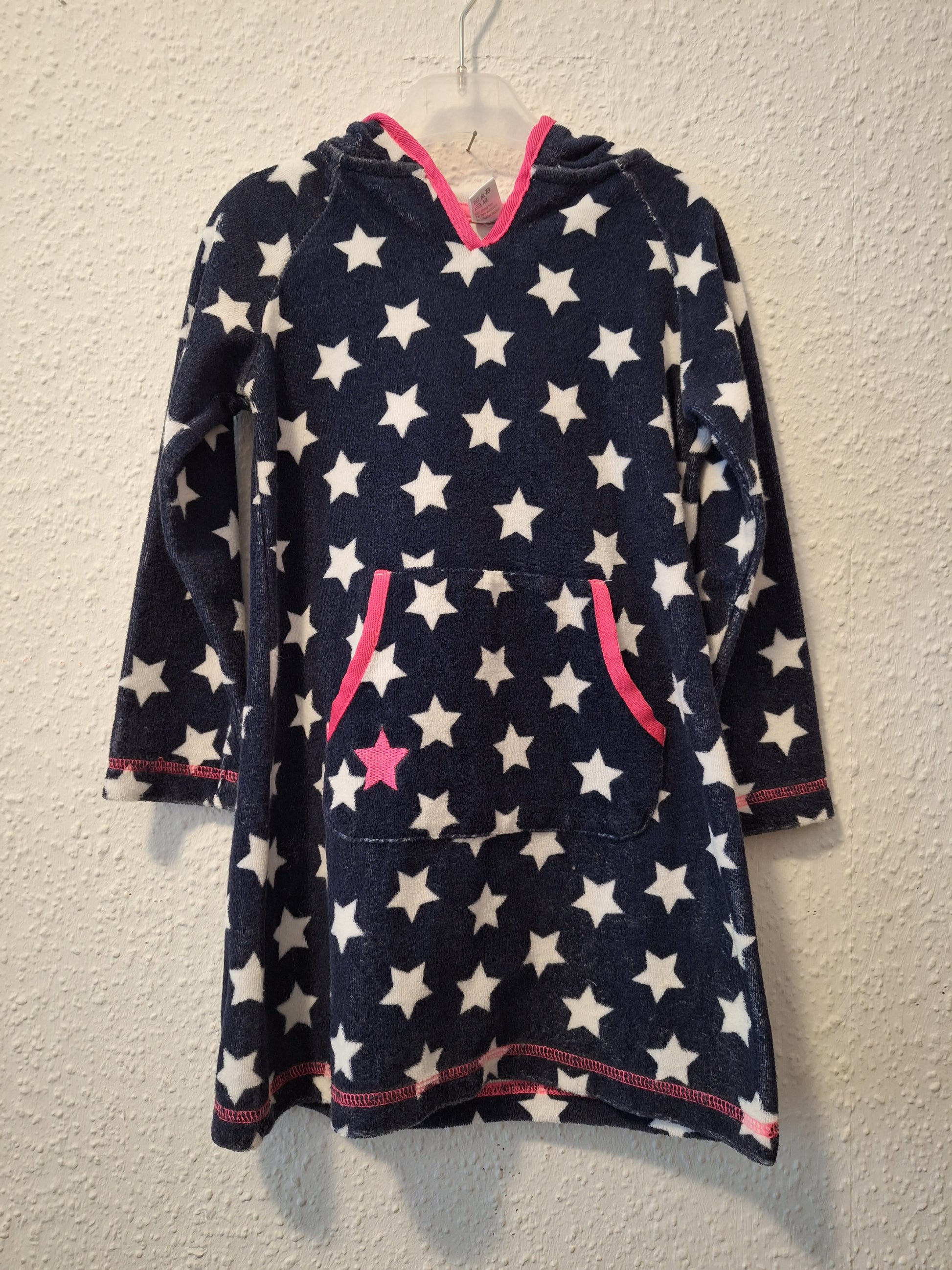 Gemütlicher Badeüberzug aus weichem Frotteestoff für Kinder in Dunkelblau. Das Design besticht durch weiße Sterne und eine pinke Umrandung. Die praktische durchgehende Tasche vorne bietet Platz für kleine Lieblingsgegenstände. Mit Kapuze für extra Wärmeschutz nach dem Baden oder Schwimmen.