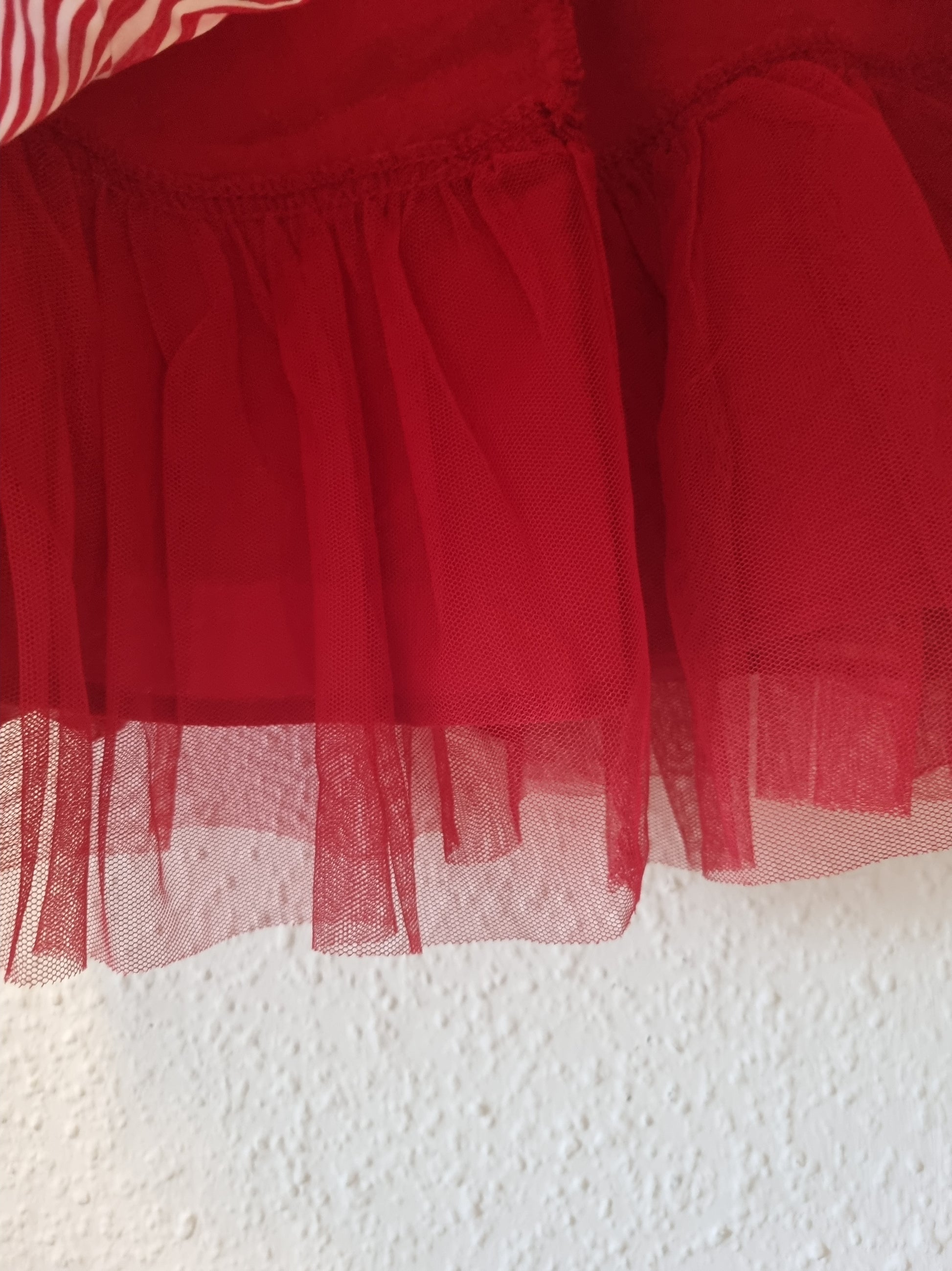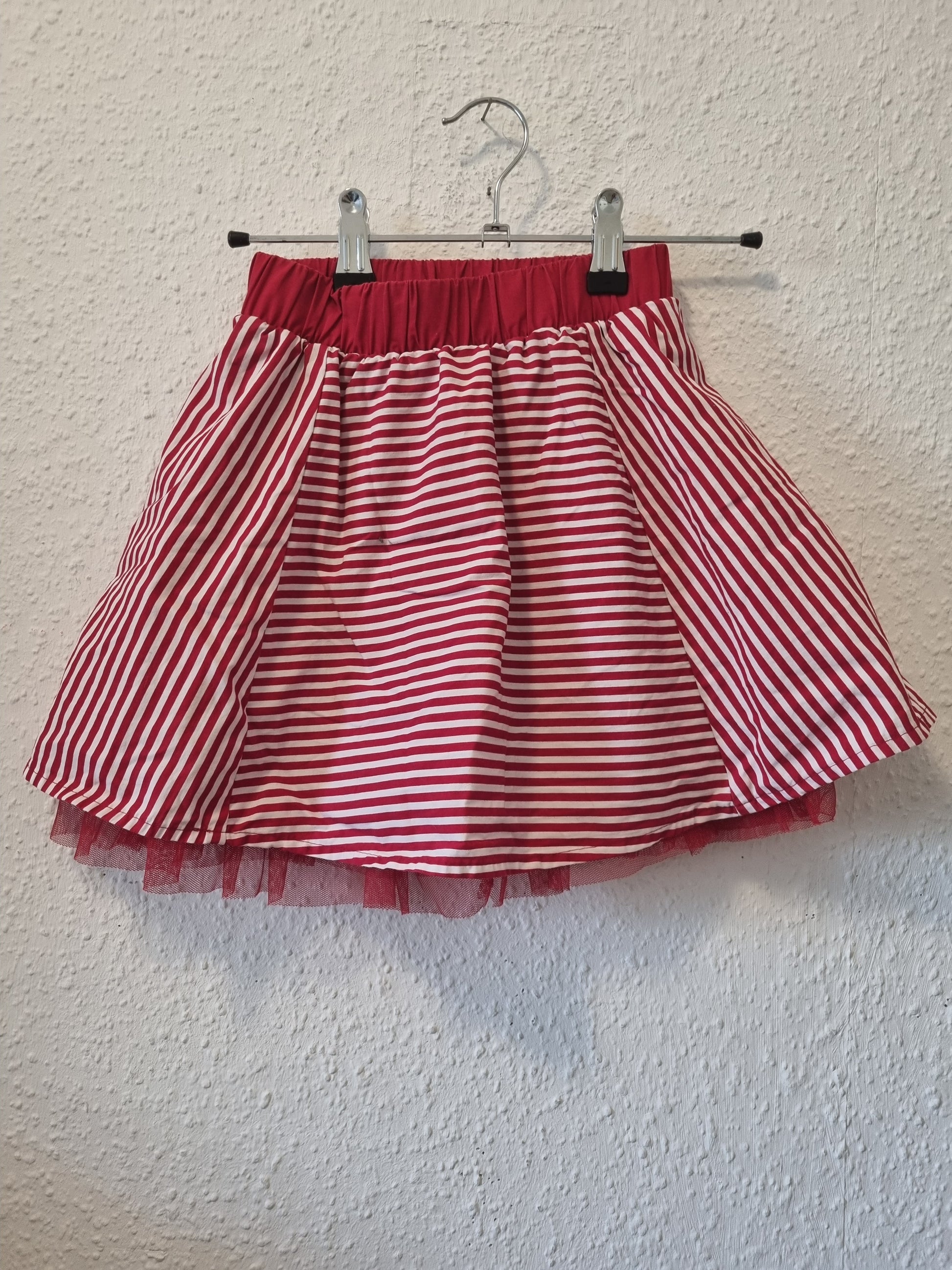 Dieser rot-weiß gestreifte Kinderrock hat einen roten Gummibund für angenehmen Halt. Der Unterrock ist teils mit Tüll besetzt, was dem Rock eine leichte und verspielte Note verleiht. Ideal für den Alltag und besondere Anlässe.