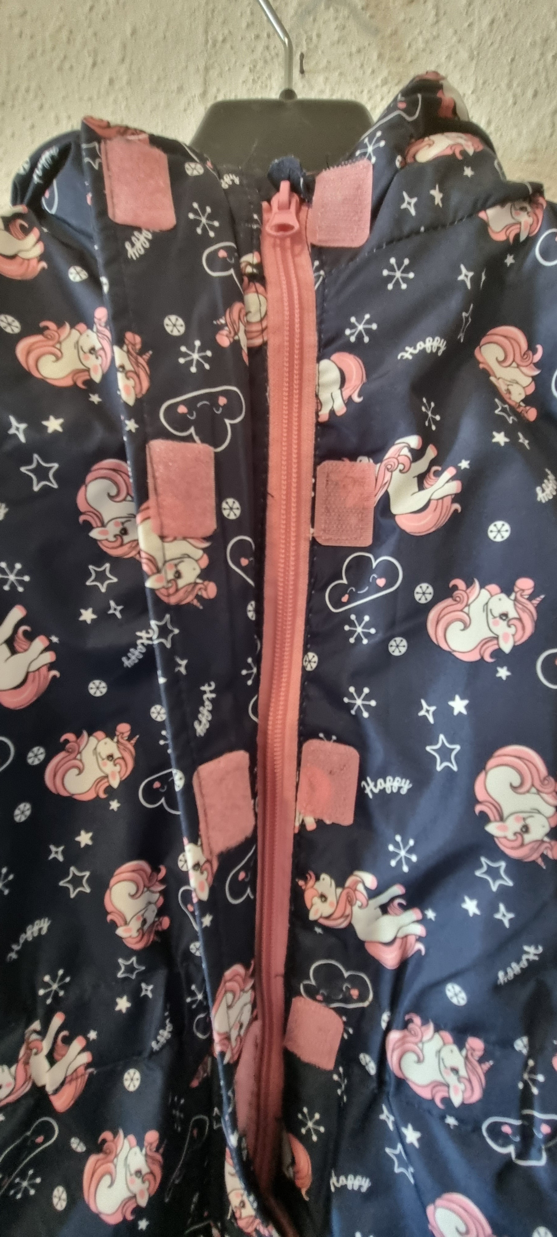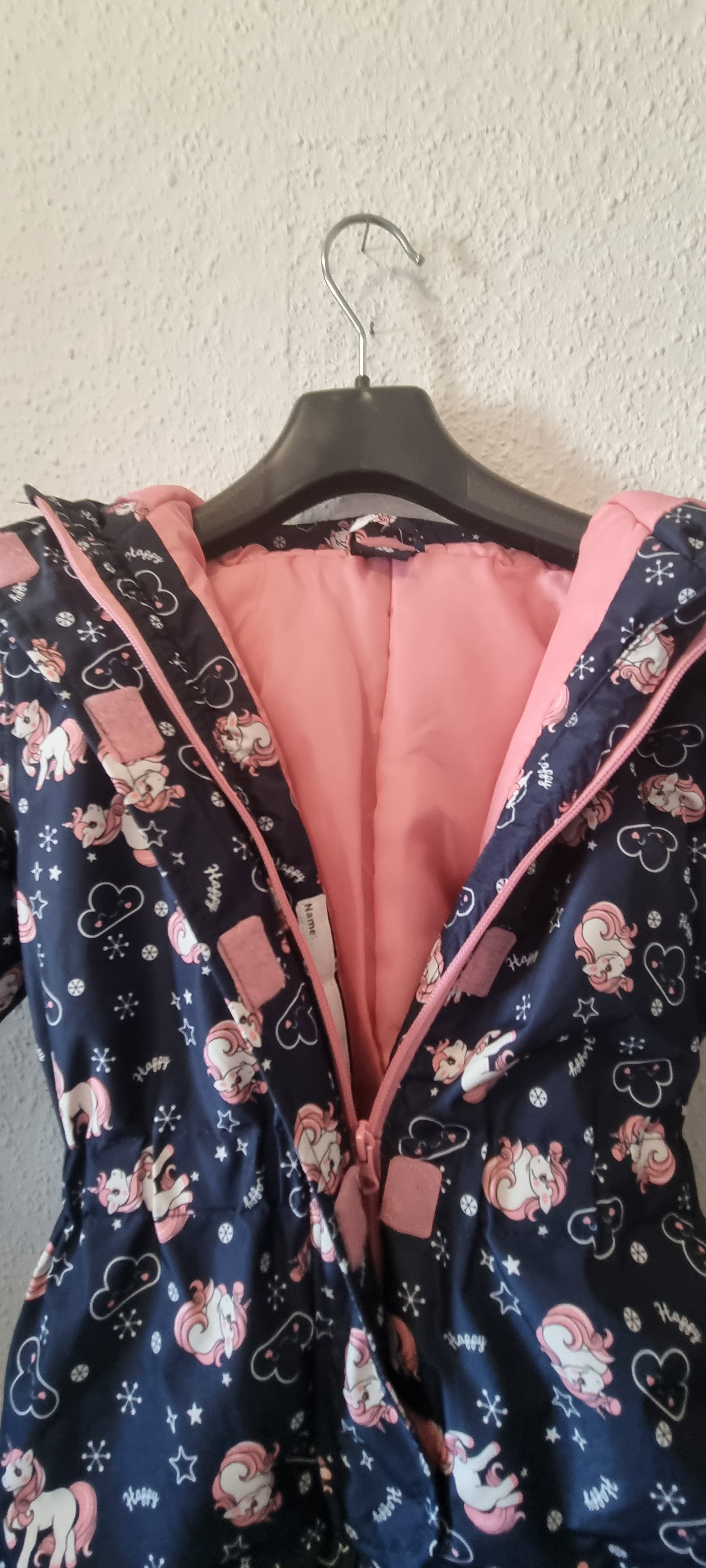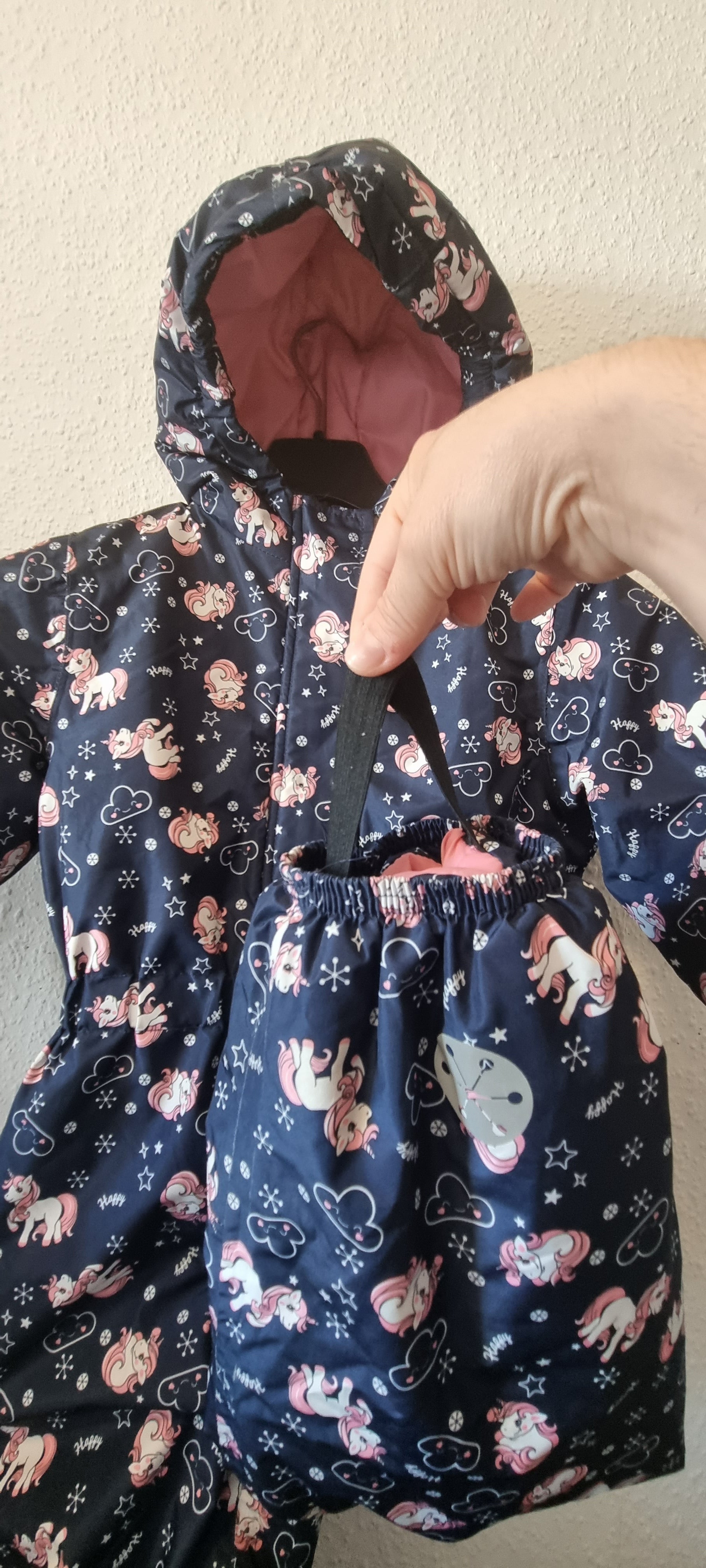Dicker dunkelblauer Schneeanzug mit Kapuze und Einhorn-Motiv für Kleinkinder. Das rosa Innenfutter hält warm, während der rosafarbene Reißverschluss vorne und der zusätzliche Klettverschluss das Anziehen erleichtern. Das Gummiband am Fußende sorgt dafür, dass die Stiefel sicher sitzen – perfekt für kalte Tage.